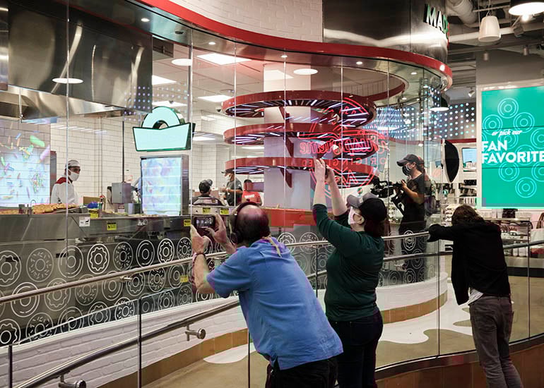 The store, described as a ‘Doughnut Theater’, boasts many spectacular digital elements, including the world’s largest rotating HOT NOW sign, the largest glazed waterfall and LED digital conveyor belt. Add the sights and smells of the whole production line and visitors enjoy a truly immersive experience.