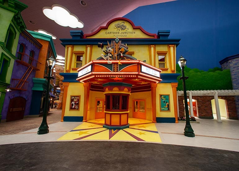The audience takes a backstage tour, meeting in a themed room featuring a large-scale ‘Charact-O-Matic’ screen that displays images driven by interaction with selected members of the audience. Back on the main stage, a large screen is used to project images of Loony Tunes characters and support interaction with the audience.